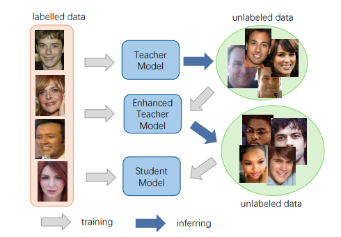该方案针对真实应用中对人脸图像质量快速筛查的需求,提出了 “教师–学生双阶段自训练与知识蒸馏框架”。研究团队首先构建高性能教师模型,利用海量无标注人脸数据进行自增强学习,再通过知识蒸馏训练轻量级学生模型,实现了性能与效率的双赢。最终模型在显著降低计算复杂度的同时,依然保持了与大模型相当的质量评价能力,为实际应用提供了高效可靠的解决方案。
