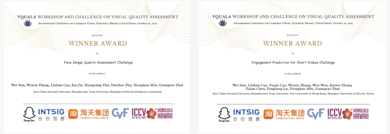 本届ICCV会议举办的VQualA(Visual Quality Assessment Competition)研讨会设有多个挑战赛,涵盖AIGC视频、人脸图像质量评估、短视频热度预测等前沿领域。华东师范大学通信与电子工程学院孙伟课题组凭借创新技术方案,在人脸图像质量评估(FIQA)与短视频热度预测(EVQA-SnapUGC)两个赛道中均荣获冠军,展现了强劲的科研实力与国际竞争力。
