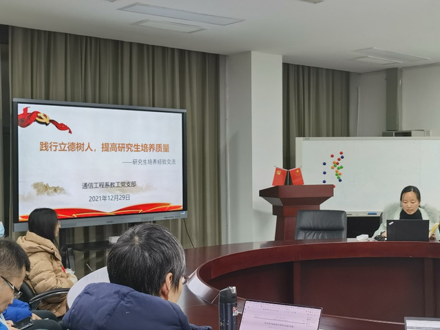 为深入学习十九届六中全会精神,并将全会精神贯彻落实到研究生培养过程中,12月29日下午,通信工程系教工党支部在信息楼133会议室开展了以“践行立德树人,提高研究生培养质量”为主题的组织生活会,会议由支部书记周梅主持。