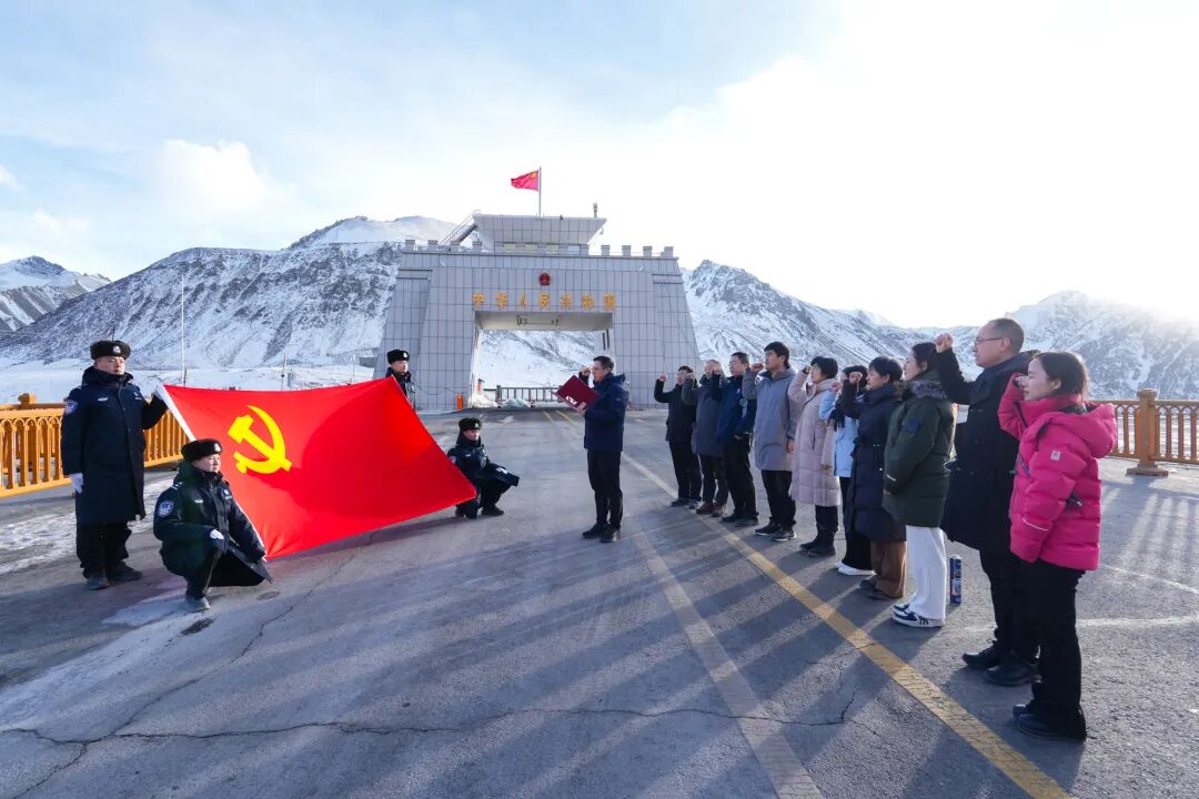 学员们来到红其拉甫国门,在海拔5100米的高原上,大家沉浸式体验戍边人凿冰取水、风雪巡逻等日常工作,亲身感受“生命禁区”里戍边卫士的坚守与担当。通过珍贵史料、实物展品和戍边故事,老师们重温了红其拉甫边检站的发展历程与戍边传统。期间,在海拔5100米的红其拉甫国门前,通信与电子工程学院参训党员在党委书记夏冰的带领下庄严宣誓。