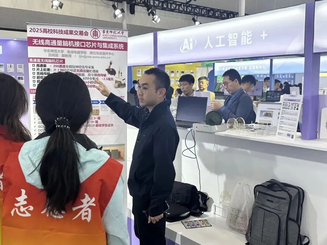 我校共7项创新成果在高校展区展出,受到观众的广泛关注。其中,学院参展的“10Kg超小紧凑主动型氢原子钟”与“无线高通量脑机接口芯片”两项成果入选成果超市高端装备、人工智能+专区展区进行实物展。