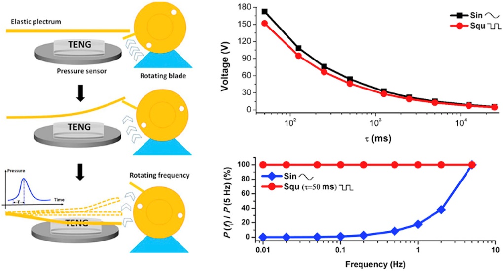 在摩擦纳米发电机(TENG)研究的推动下,机械能已能够被广泛收集。尤其在低频机械能采集方面,摩擦纳米发电机(TENG)与电磁式发电机相比有着天生的优势。但是对于小于1 Hz的超低频机械能的收集对摩擦电纳米发电机来说仍具有挑战。在这项研究里,通过调制机械振动实现了TENG对超低频机械能的采集。研究推导了TENG的等效电路模型,以理论分析具有不同振动波形的超低频机械能对基于TENG的能量采集的影响。该理论模型对TENG采集具有不同振动波形和接触释放时间的超低频机械能提供了合理的解释,理论模型与实验结果保持一致。研究发现,通过减少接触释放时间,即使机械输入频率为0.1 Hz,TENG的能量采集效率也可以得到显着提高。这项工作加深了对使用TENG收集超低频机械能的理解,并为在宽频率下收集各种机械能的TENG的设计提供了重要的参考依据。该项研究成果发表在2019年的《Nano Energy》上。