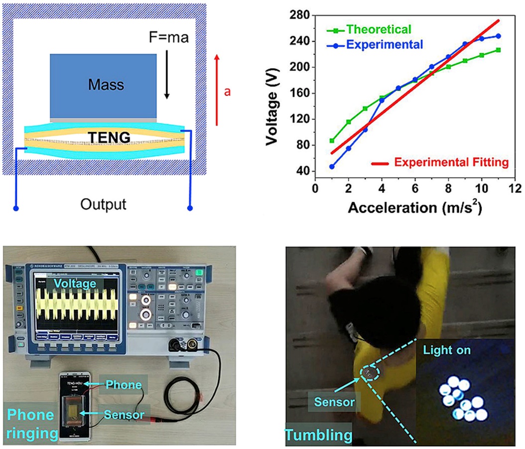 图5. 自供电高灵敏度加速度传感器结构示意图、输出性能和应用演示