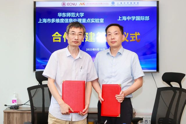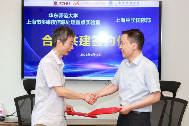 9月18日下午,华师大上海市多维度信息处理重点实验室主任李庆利教授和上海中学国际部初小段校长刘炼老师分别代表双方签署共建合作协议。华东师范大学通信与电子工程学院通信工程系支部书记周梅老师、科创指导田应洪老师、辅导员王海建老师、陈建刚老师,与上海中学国际部初小科技总指导姚昇华老师等共同参与了此次签约仪式。