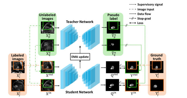 其次,针对教师学生网络中迫使网络在模棱两可的区域保持彼此一致导致网络训练不可靠的问题,提出了基于高熵学习的在线蒸馏以及基于示例包级别的伪标签方法,通过引入温度缩放至深度互学习网络以及注意力机制引导的示例包级别伪标签,克服了医学图像任务中熵最小化的缺点以及像素级别伪标签难以容忍标签噪声的问题,极大提升了训练过程的稳定性。