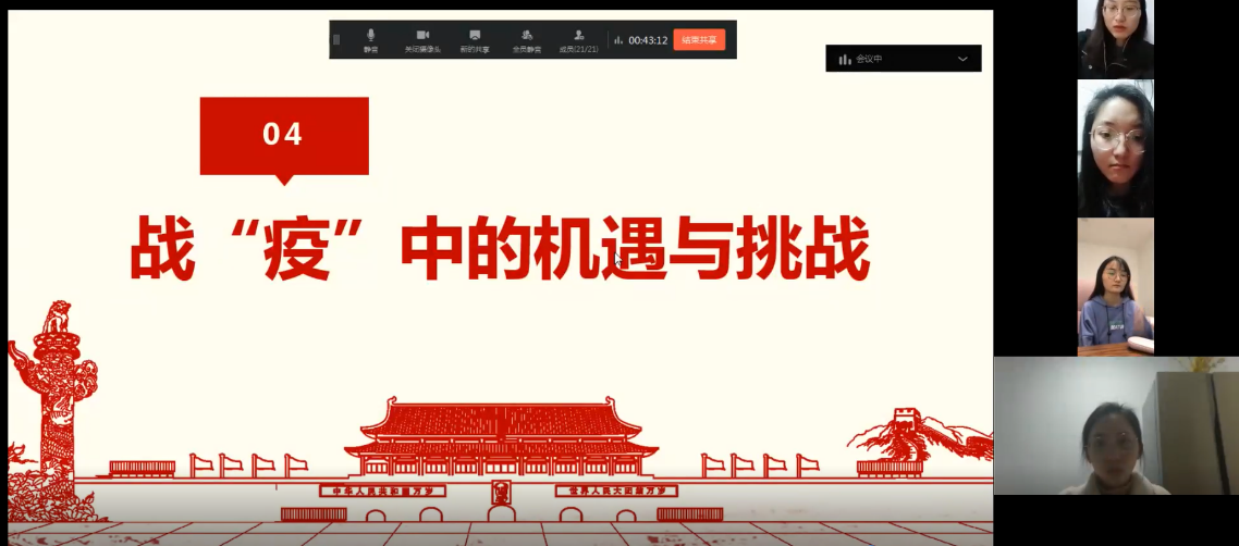 各支部党员们一起畅谈疫情中的感人瞬间,聚焦疫情中的“逆行者”,他们坚定的信仰、无私的大爱和奉献精神,挺起了“中国的脊梁”,值得我们所有党员学习,坚守共产党员的初心。学生党员也积极发言,一定服从学校的决策和安排,积极配合学校的各项工作,认真遵守国家防疫有关政策,通过“云课堂”努力学习,停课不停学,为全面打赢疫情防控狙击战做出自己应有的贡献。
