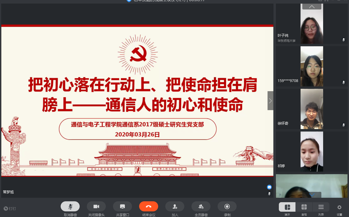 为进一步贯彻落实习近平总书记关于新型冠状病毒感染的肺炎疫情防控工作的重要指示精神,发挥党支部和党员在防疫控疫工作中的战斗堡垒和先锋模范作用,根据《关于组织开展“把初心落在行动上、把使命担在肩膀上”主题党日活动的通知》的要求,通信与电子工程学院各党支部结合疫情防控期间工作实际,于3月运用“学习强国”视频会议组织开展线上主题党日活动。