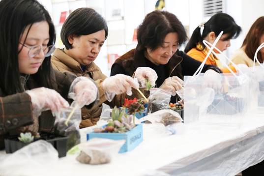“多肉木盒”活动在外请指导老师的带领下如火如荼展开,各位女性教职员工各自挑选心仪的多肉植物小型盆栽,并进行制作,最终将成品带回用以装点生活和工作环境,美化环境和身心放松两者兼得。此次活动在温馨快乐的氛围中落下帷幕。