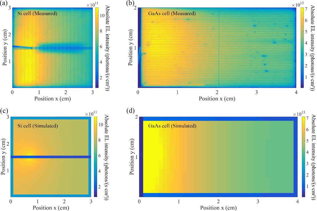 研究团队针对晶硅、砷化镓以及铜铟镓硒三种太阳能电池样品,一方面实验测得了电池在一系列注入电流密度下的绝对EL图像,另一方面对电池进行了等效电路建模仿真。结果表明,实验数据与模拟数据之间保持高度吻合,这就很好地验证了模型的可靠性以及准确性。进一步通过比较实验测试与模拟仿真得到的在缺陷处EL强度随注入电流密度的变化趋势,准确地鉴别出电池的各种缺陷类型,并揭示出缺陷背后的电阻参数值(Prog Photovolt: Res Appl. 2020;28(4):295-306)。