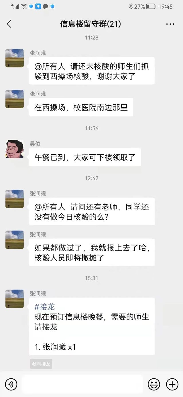 张润曦教授因为科研项目时间紧张,同时为了在学校更好地准备网课,留在了信息楼,临“危”受命成了信息楼的“楼长”,一名党员就是一面旗帜,张润曦教授发挥党员模范带头作用,建起了信息楼留守群,和同学们一起在信息楼“安家”,通知被封在信息楼的通信学院和物理学院的师生们用餐和做核酸。封闭期间张润曦教授带领项目组取得了“华为杯”第四届中国研究生创“芯”大赛全国最高奖创芯之星、全国优秀组织奖、格科微企业大奖全国一等奖1项、二等奖 4 项的优异成绩,张润曦教授荣获全国优秀指导教师奖。