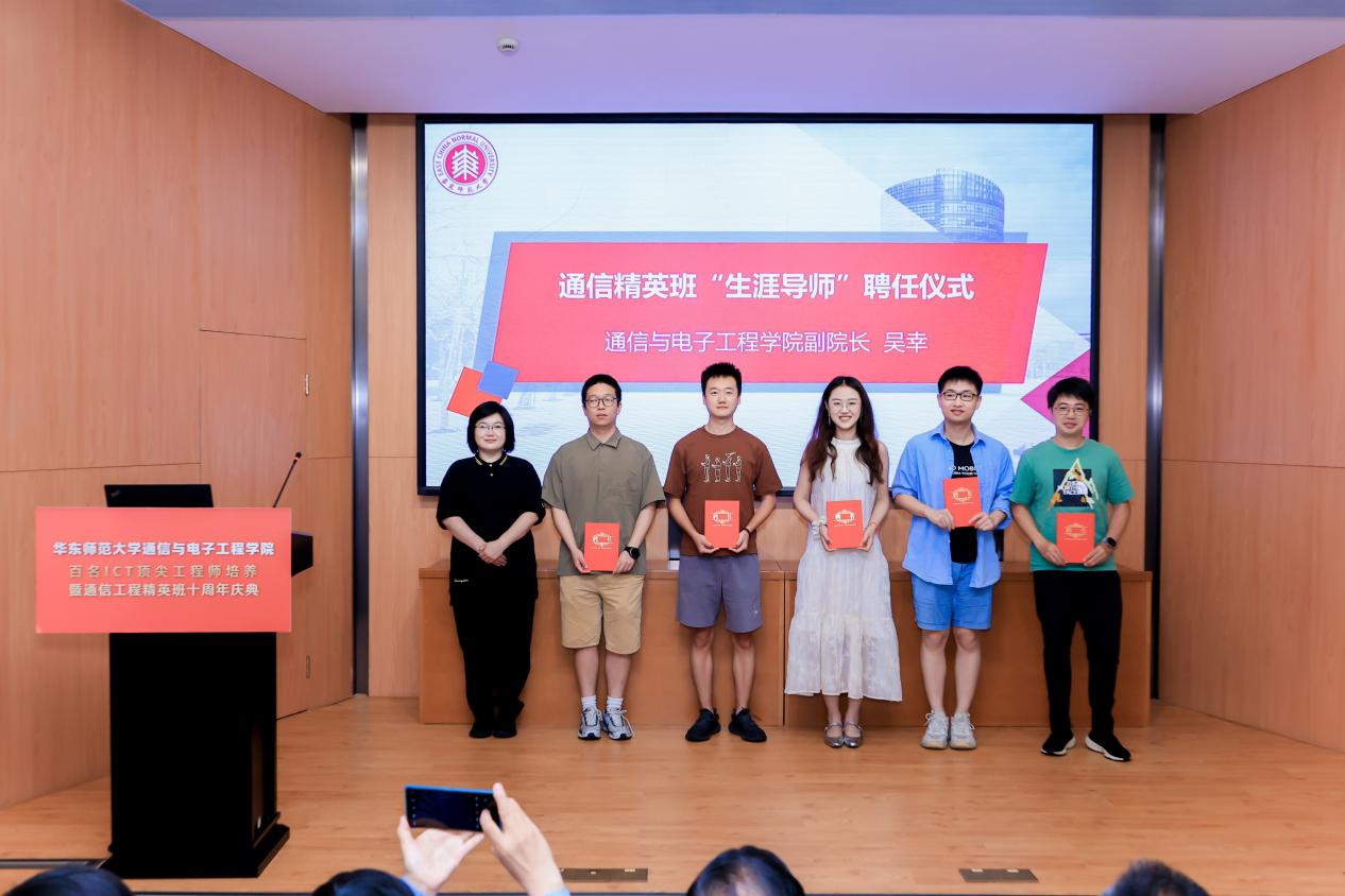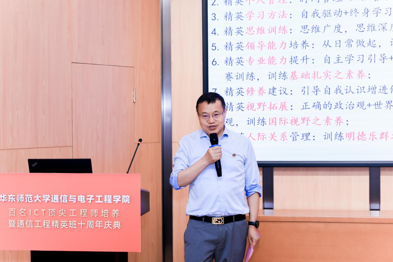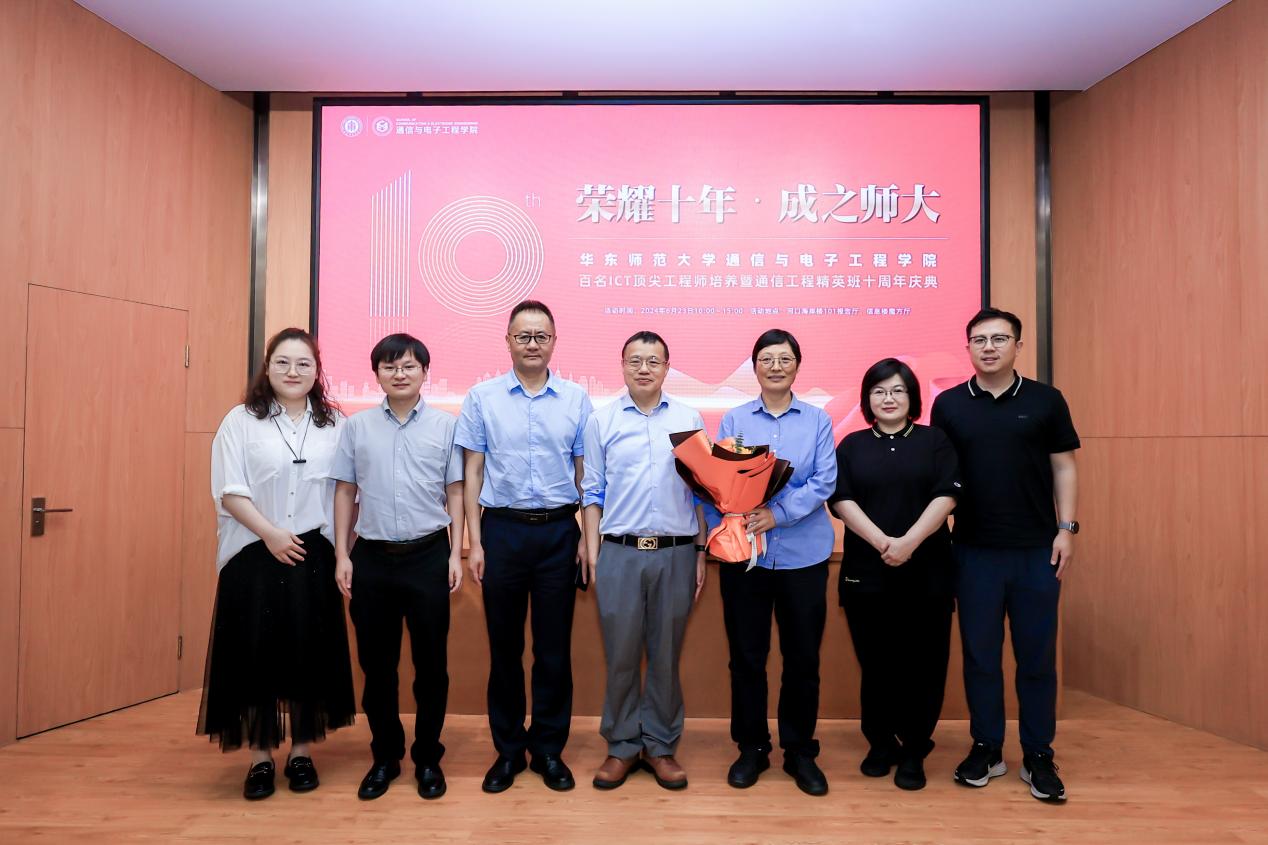 2024年6月23日,通信与电子工程学院百名ICT顶尖工程师培养暨通信工程精英班十周年庆典在河口海岸楼101报告厅隆重举行。华东师范大学校友工作办公室、教育发展基金工作办公室主任任开蕾,华东师范大学通信与电子工程学院通信工程精英班班主任、学院双创中心主任刘一清,华东师范大学国资处处长、通信与电子工程学院副教授王淑仙与通信与电子工程学院党委副书记、副院长夏冰、副院长乔德礼、副院长吴幸共同见证精英班荣耀时刻。典礼由2017级通信工程精英班成员、2024届电子信息专业硕士研究生王泽宇主持。