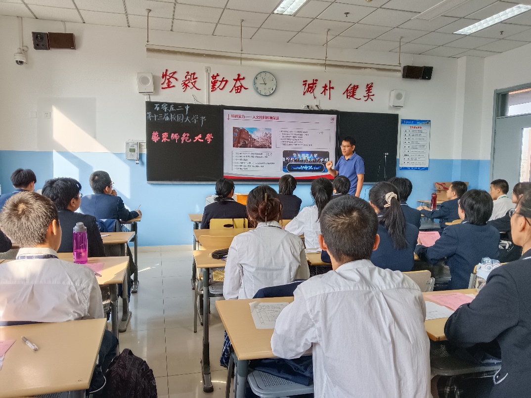 10月14日上午,王海建、姚燕珊赴石家庄二中开展招生宣讲工作。在石家庄二中,招生组从一流名校、卓越育人、爱在师大、师大之路等四个方面,向高三学生开展了两场招生宣传讲座,详细介绍了华东师范大学的学科优势、专业特色、育人特点。并对高三学生提出的学校优势学科、国家专项和优师专项的区别、双学位培养特点等问题进行了交流解答。