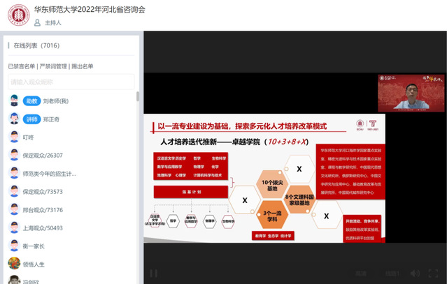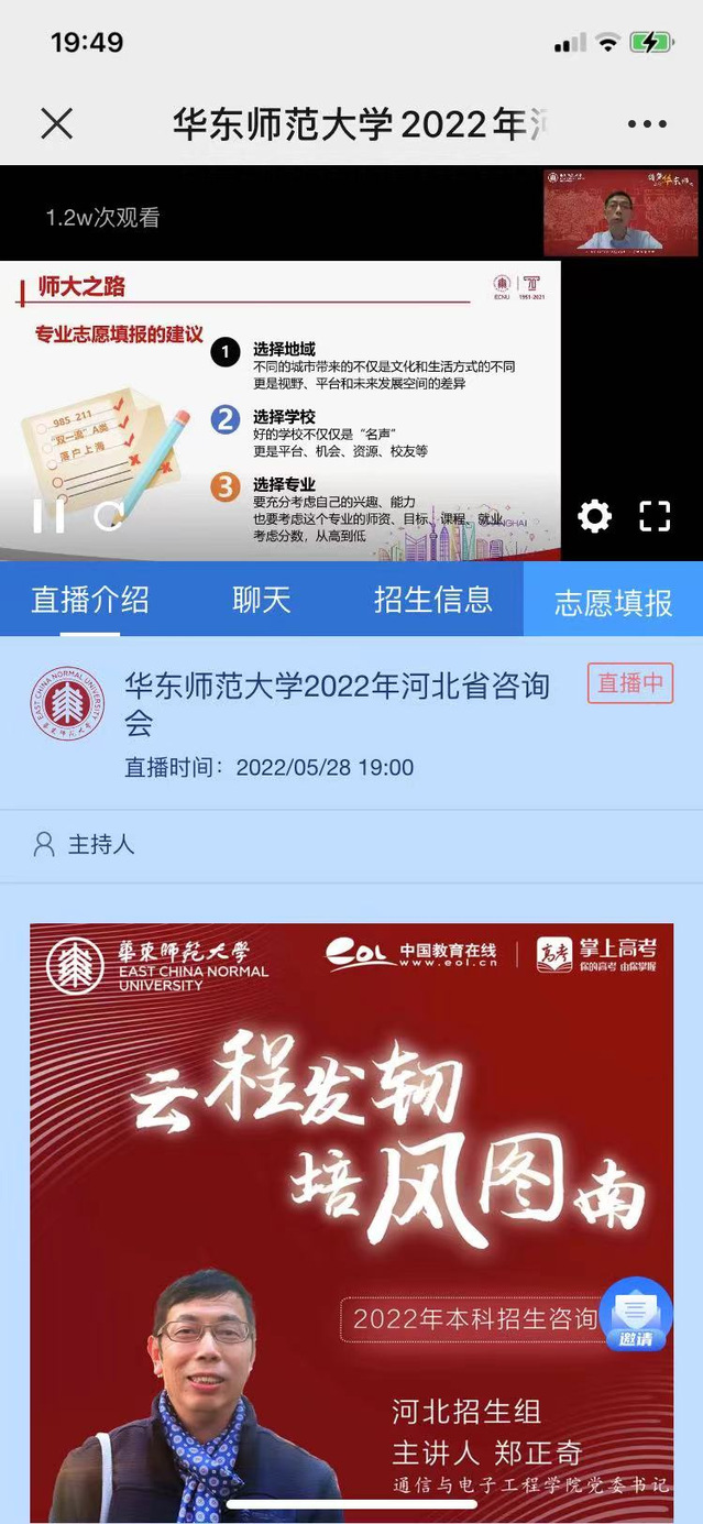 5月28日晚上7:00,华东师大河北招生组组长、通信学院党委书记郑正奇教授通过中国教育在线平台,为河北省2022届高考学子带来了一场题为“云程发轫 培风图南”的本科生招生咨询会,近13000名来自河北省的高考学生、家长观看了直播宣讲。