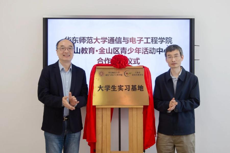 4月27日上午,金山区教育局与通信与电子工程学院合作揭牌仪式在金山区青少年活动中心举行。金山区教育局副局长李松皓和通信与电子工程学院副院长李庆利共同揭牌。