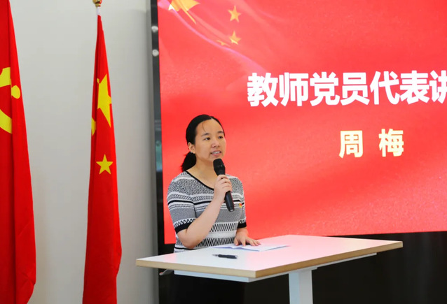 通信工程系教工党支部周梅同志作为教师党员代表交流发言,她谈到作为一名党员教师,立德树人是根本任务,自己将会立足岗位,不断创新,发挥党员的模范带头作用,为国家和社会培养优秀的通信人才。