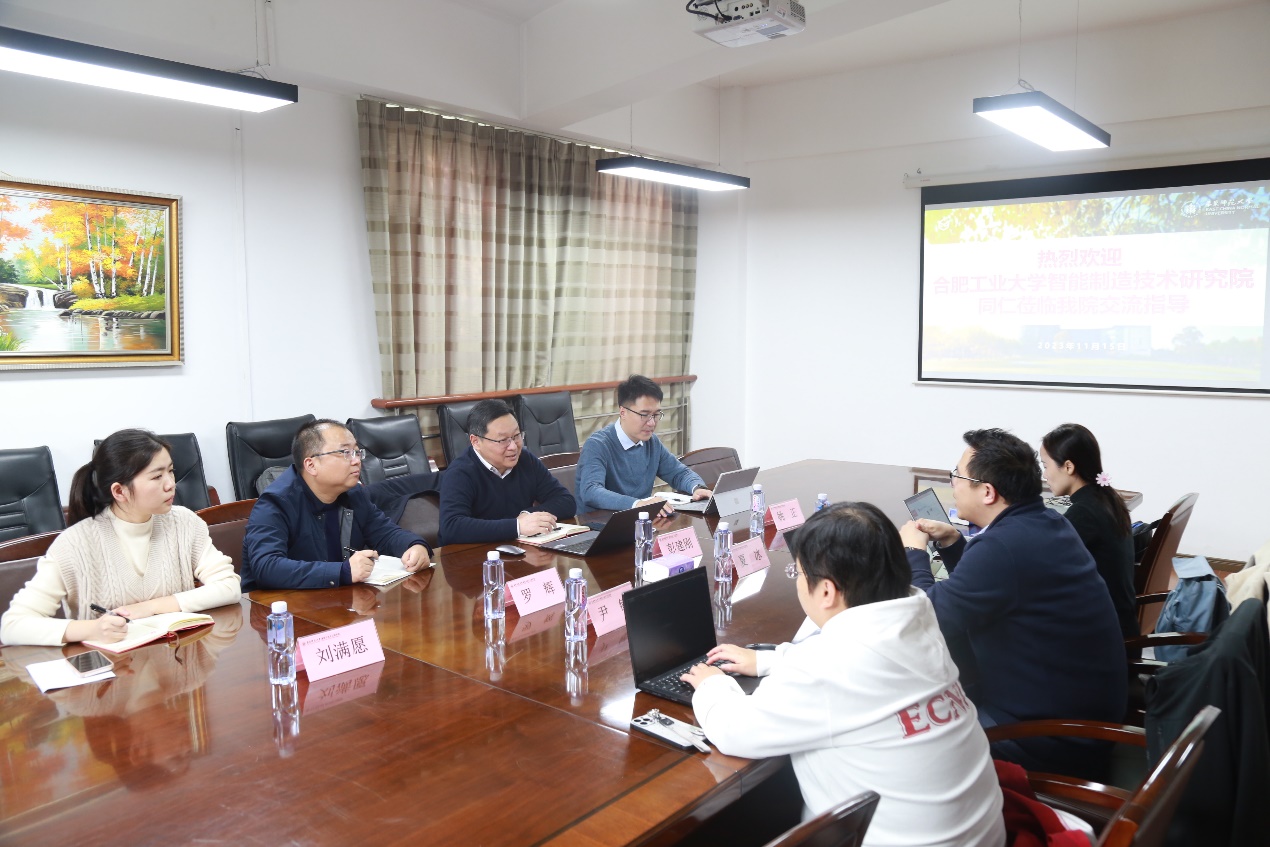 2023 年11月15 日,合肥工业大学智能制造技术研究院党支部书记、副院长彭建刚一行来我院开展党建等相关事宜调研。学院党委副书记、副院长夏冰,专职组织员李晓婉和院办尹敏老师参加座谈。