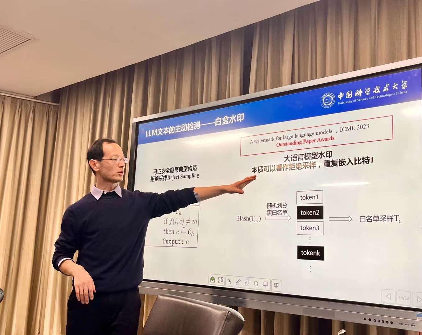 张卫明教授详细讲解了目前现有的被动检测和主动检测的方法,在主动检测方法提出了核心理论问题,探讨在生成文本中是否可以无损(不影响模型生成质量)嵌入水印。