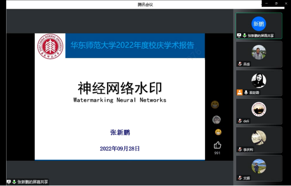 在华东师范大学71周年校庆即将到来之际,为开阔师生文化素养与学科视野,2022年9月28日,华东师范大学通信与电子工程学院特邀请复旦大学张新鹏教授开展主题为“神经网络水印”的校庆学术报告。华东师范大学通信与电子工程学院院长吕岳教授主持会议,相关专业教师、研究生、本科生等200余人线上参会。