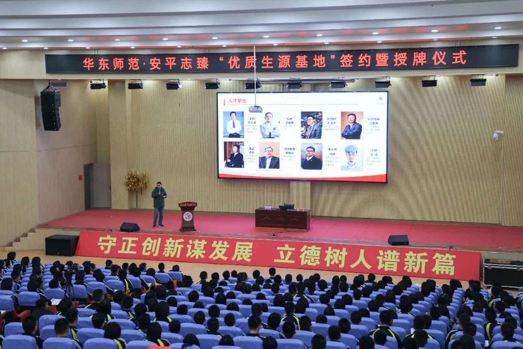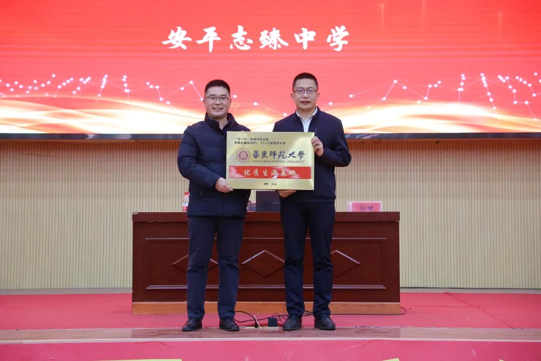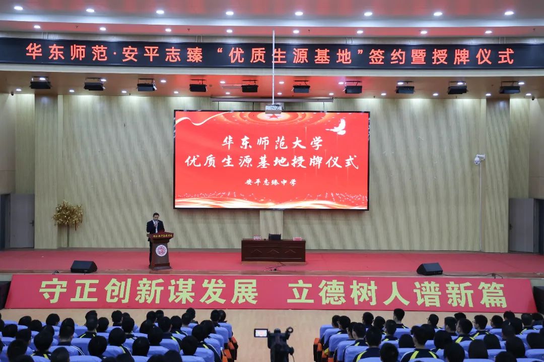 9日上午10:30,华东师范大学优质生源基地授牌仪式在志臻中学报告厅举行,李庆吉代表学校向志臻中学授予“优质生源基地”牌匾,志臻校长回世杰代表学校接受牌匾。