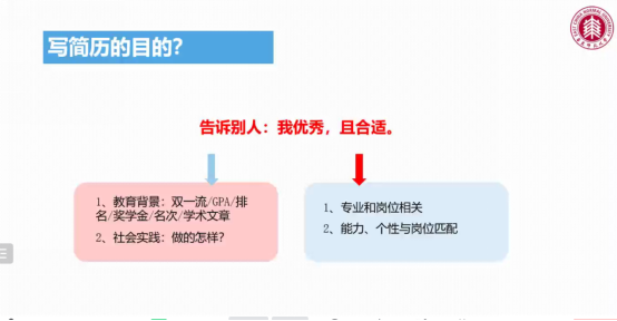 在讲座过程中,李铮老师用大量的简历文案进行分析教学,详细分析了简历制作时,如何真实、简洁、明晰、有效地把自身的优势体现出来,并要把这种优势与公司的岗位匹配起来,抓住公司HR的眼球,吸引HR的关注。