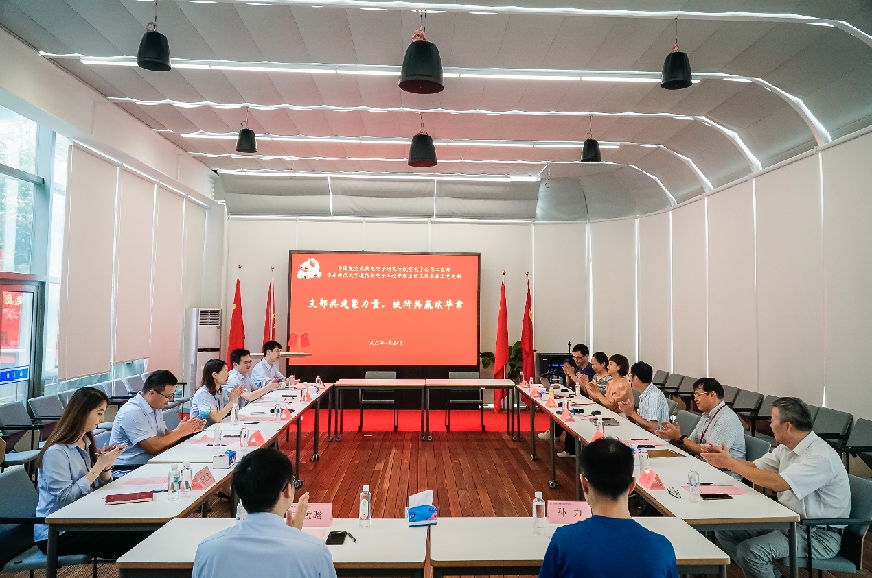 2021年7月29日上午,中国航空无线电电子研究所航空电子公司二支部与通信与电子工程学院通信工程系教工党支部在我校闵行校区开展2021年度支部共建活动,以国家战略需求为牵引,以同源技术研究为基础,找准产学研合作切入点结合点,推动支部共建落实落地。上海航空电子有限责任公司(以下简称SAVIC)总经理兼党总支书记丁晗、SAVIC航电系统部部长陈芳、航空电子公司二支部书记刘传益、宣传委员毛佳雯、党小组长傅亮,通信学院党委书记郑正奇、双创中心主任刘一清、院长助理蔡小梅、支部书记周梅等参加共建活动。活动由通信系教工党支部书记周梅主持。