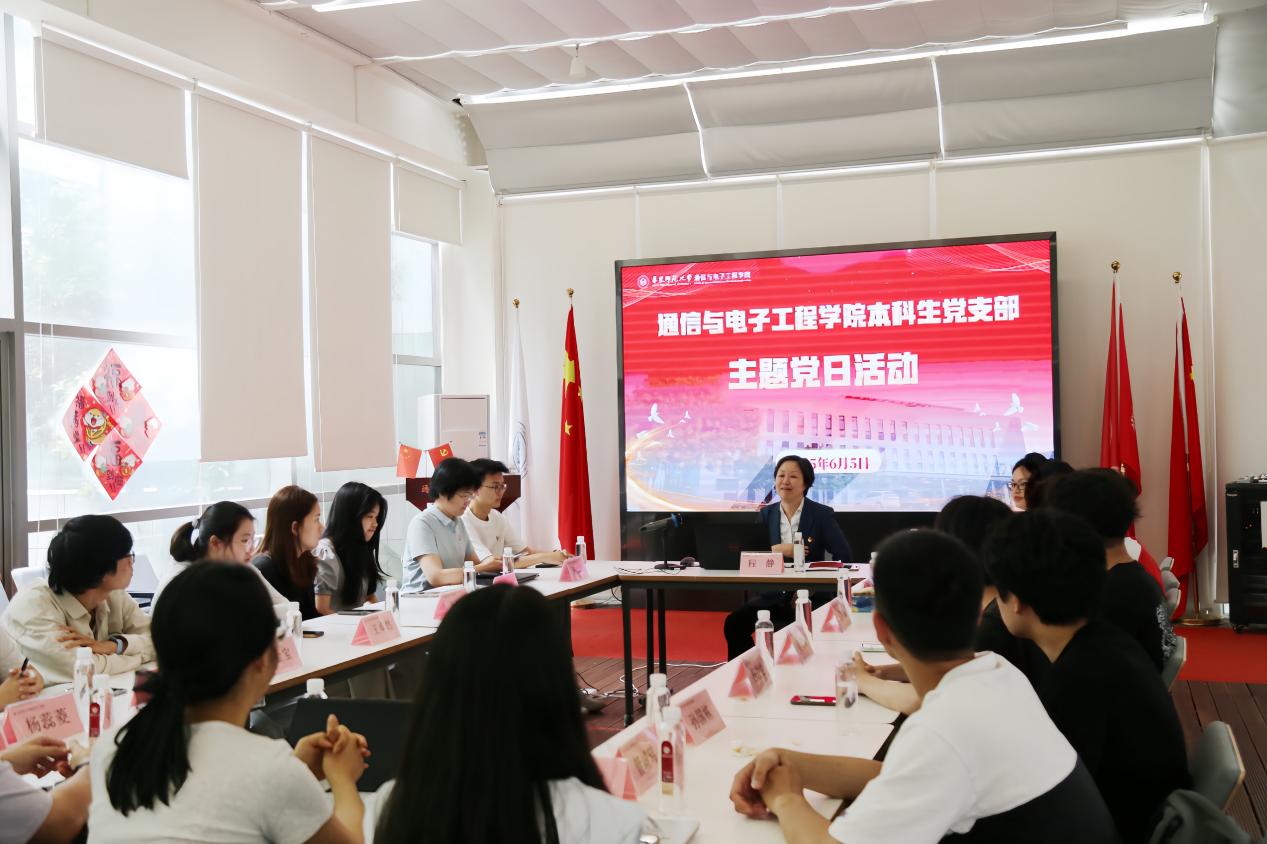 2025年6月5日,通信与电子工程学院本科生党支部主题党日活动暨2025届毕业生党员座谈会在闵行校区信息楼魔方厅举行。学校党委常委、副校长程静为本科生党支部讲授《严守党纪党规 涵养优良学风》专题党课,并与毕业生党员座谈交流。通信与电子工程学院党委书记夏冰、副书记王山玲、本科生党支部党员、2025届研究生毕业生党员代表参加了活动。