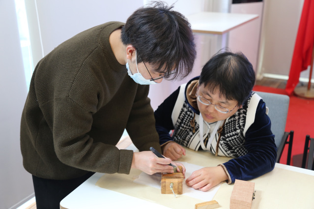 在篆刻过程中,大夏印社的社员老师们对教工们进行一对一的指导,大家迅速掌握了篆刻的基本要领和注意事项,手握刻刀,转动印床,根据印花修整完成。