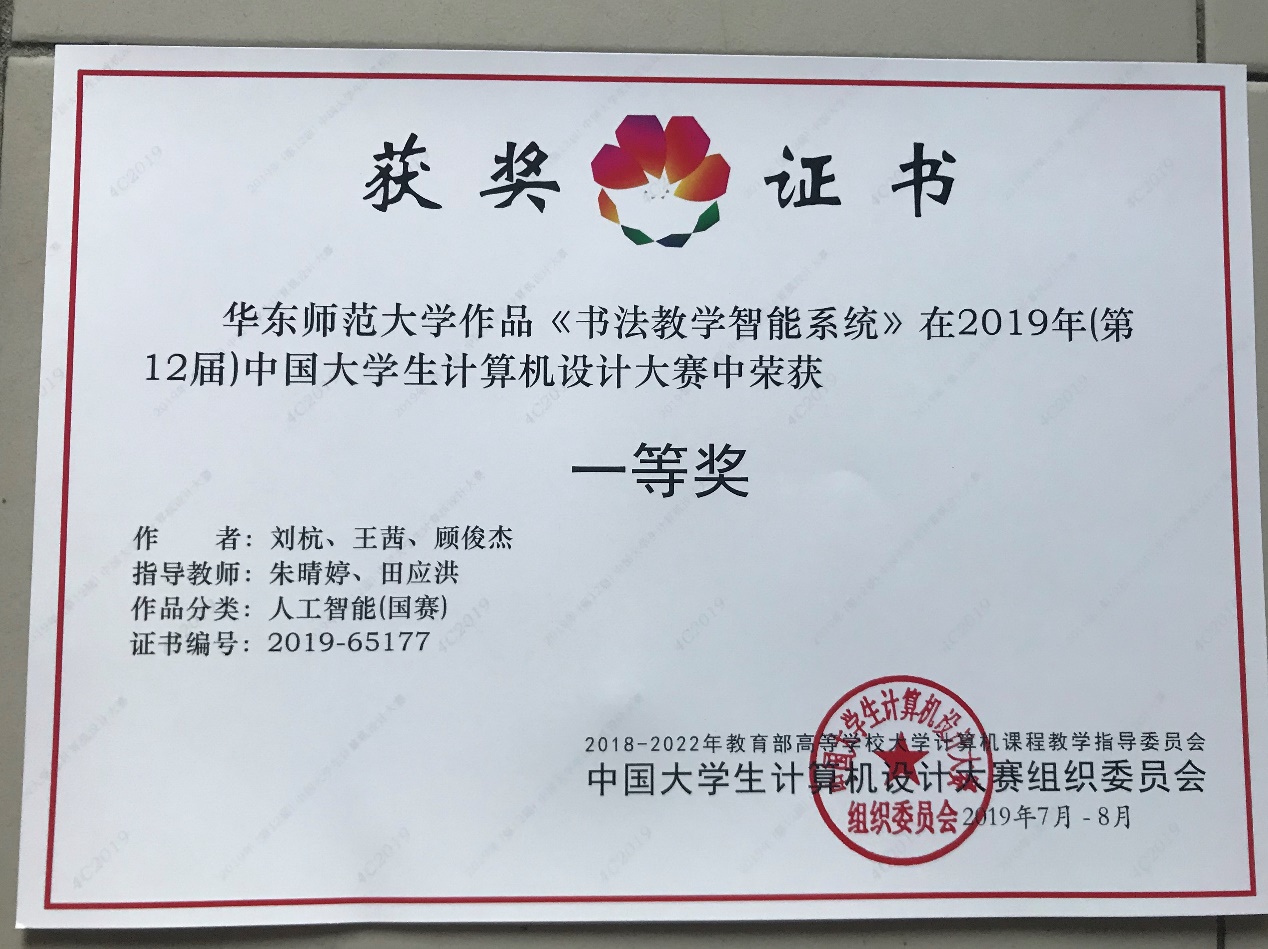 2019年7月20日,由中国大学生计算机设计大赛组织委员会主办,吉林大学承办的“2019(第12届)中国大学生计算机设计大赛” 人工智能、数媒普通组、数媒专业组决赛在吉林大学落下帷幕,华东师范大学通信与电子工程学院微电子“菁英班”2017级本科生刘杭、2016级本科生王茜、2016级本科生顾俊杰的团队作品《书法教学智能系统》喜获人工智能组一等奖的好成绩,该作品由通信与电子工程学院田应洪老师、计算机科学与工程学院朱晴婷老师共同指导,融合了多种智能算法,致力于实现人工智能与书法艺术的结合。