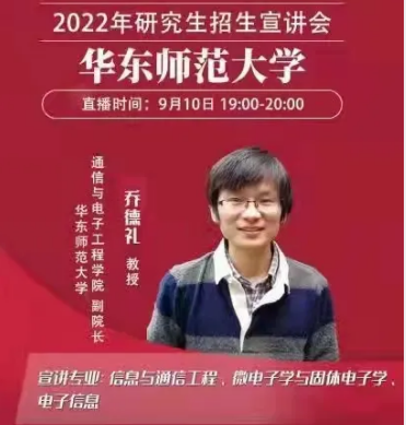 为帮助更多考生了解华东师范大学通信与电子工程学院的研究生教育特色、学科优势、师资力量和研究生报考政策,我院副院长乔德礼教授,通过网络直播形式,开展2022年信息与通信工程、微电子学与固体电子学、电子信息专业研究生招生宣讲会。