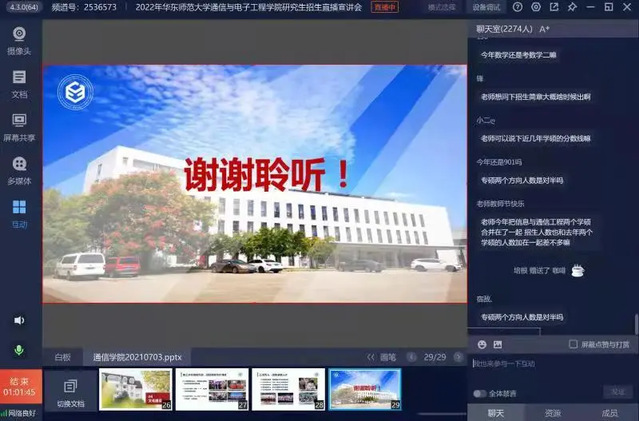 乔德礼教授就通信与电子工程学院学科专业、培养特色、科研动态、研究生录取、就业情况等进行宣讲介绍,共有2000多人参与了线上宣讲会,考生们对自己关心的问题进行了在线咨询。招生是研究生教育工作的首要环节,高质量的生源是高水平研究生教育的重要基础,线上宣讲会为学子报考志愿、选择专业提供了有效的指导帮助。