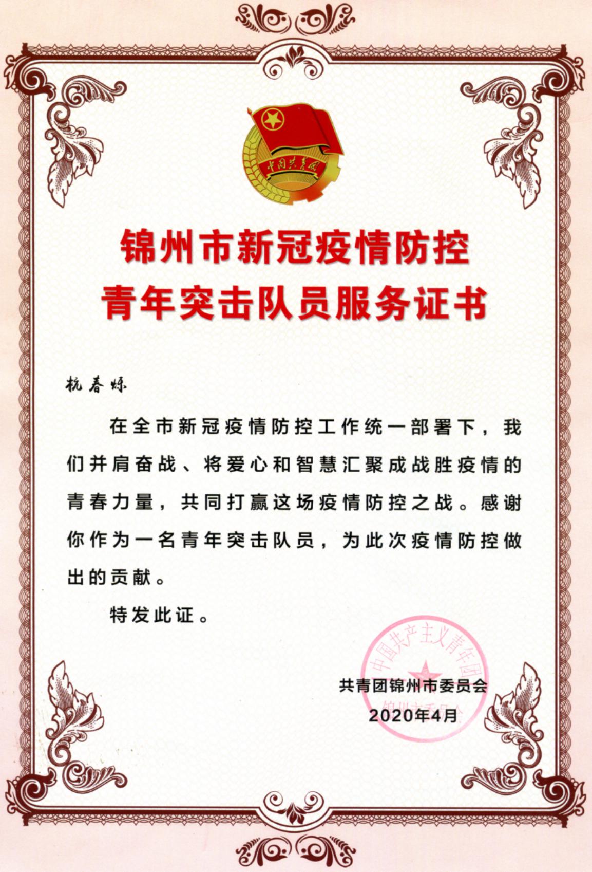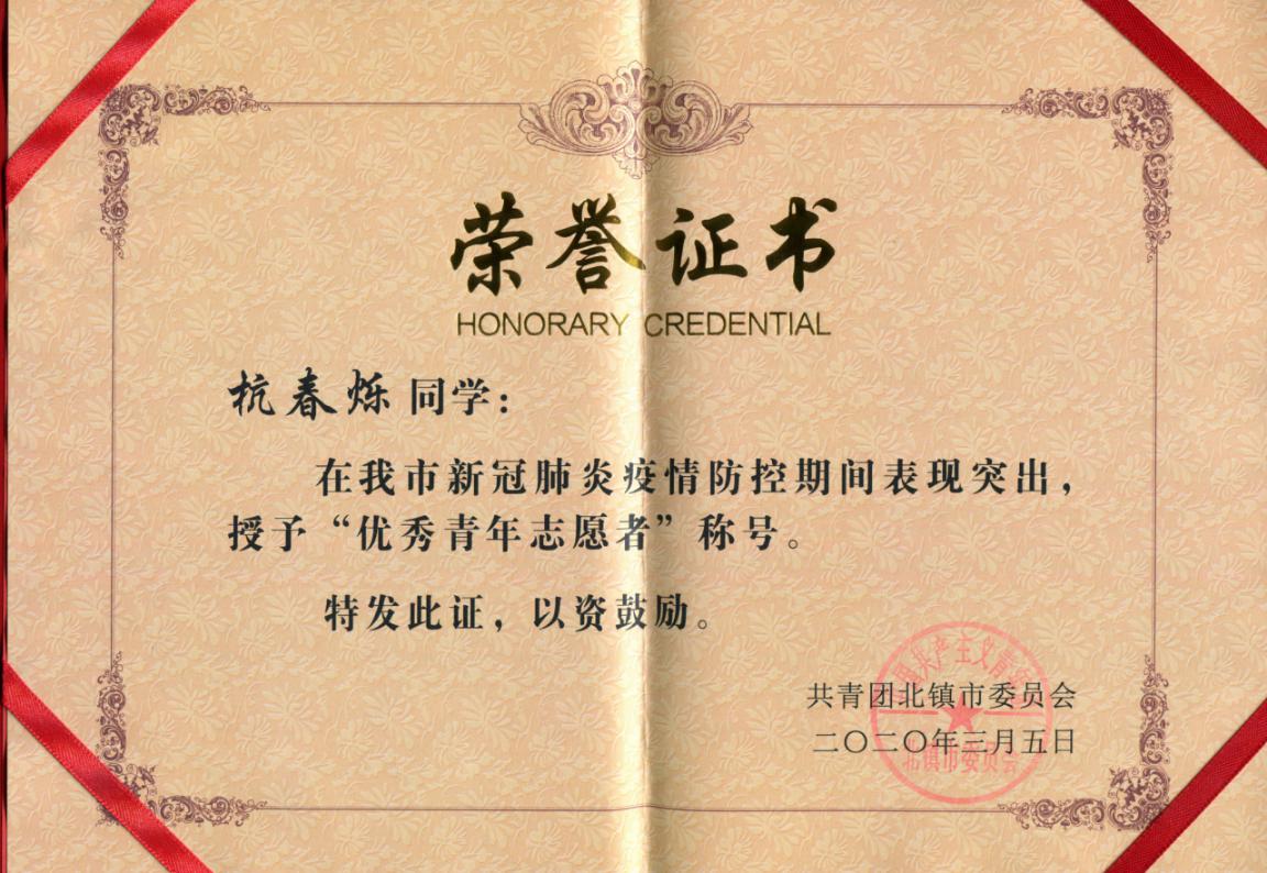 因为在疫情中表现出色,杭春烁同学被评为辽宁省北镇市“优秀青年志愿者”,还参演了由北镇疫情防控青年突击队大学生组自主拍摄的“无私奉献防疫情,志愿服务学雷锋”公益宣传微电影,以一个雷锋精神薪火相传、奉献精神传承不息的故事,向那些敢于担当、甘于奉献的逆行者们致敬。