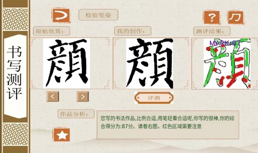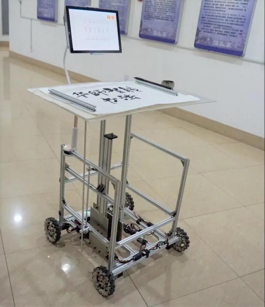 行、草、隶、篆、楷,使用者可以根据自身喜好选择合适的书法字体以及书写风格。系统利用基于向量误差的书写评析模型,通过书法字迹智能提取、智能书法评分、智能书写指导等过程,将单字书法中书写失误部位用红色标记,将书写准确部位用绿色标记。最终实现有效指导书写者进一步改进与学习的目的。同时,团队研发的另一个亮点是智能书写台。将机器人技术与人工智能相结合,造福行动不便人士,实现了智能书写台的移动以及书写台面的升降。