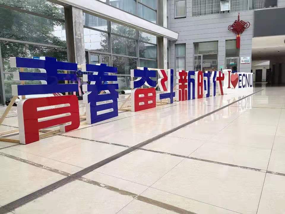 新生在学院拍照墙前合影留念