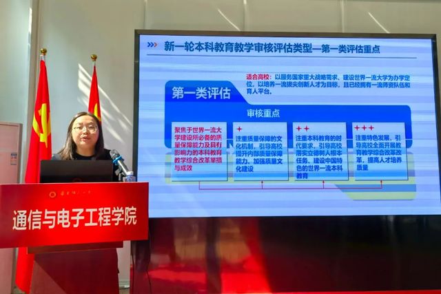 教务处经雨珠首先介绍了新一轮本科教育教学审核评估学校迎评工作进展情况,向老师们阐释了新一轮审核评估的四点意义,一是贯彻落实习近平总书记关于教育的重要论述和全国教育大会精神;二是全面对接新时代教育评价、教育督导体制机制改革要求;三是引导督促高校遵循高等教育规律和本科人才培养规律;四是聚焦本科教育教学质量全面提升。之后经雨珠强调了本轮评估的审核重点,包括要注重质量保障的文化机制,引导高校提升内部质量保障能力、加强质量文化建设;注重本科教育的时代要求,引导高校落实立德树人根本任务、建设中国特色社会主义的世界一流本科教育;注重特色发展,引导高校全面开展教育教学综合改革,提高人才培养质量。最后经雨珠还对评估的特点、时间、形式以及面临的挑战进行了简要的介绍,希望各位老师做好准备,积极应战。