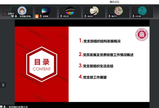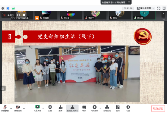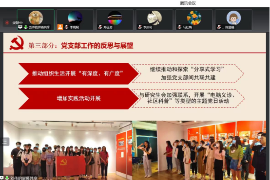 行政教工党支部书记张颖芳汇报了支部党员在疫情中所作的工作,坚持支部党建与行政管理服务有机融合,努力做好师生“润滑剂”,画好同心圆,全面助力学院工会、团委和双创等工作。