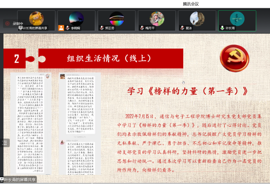 电子工程系教工党支部书记李小进就加强党员师德师风教育、宣传及监督等工作做了汇报,支部认真完成政治理论学习和党员发展工作,切实把二十大精神学习成效转化为推动工作的强大动力。