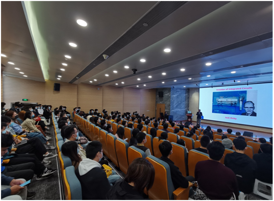 上午10:30,蒋尚义先生在闵行校区光学大楼三楼报告厅为我校师生作“集成电路工艺的创新”主题学术报告,百余名师生慕名前来,现场座无虚席。报告由孙真荣副校长主持。