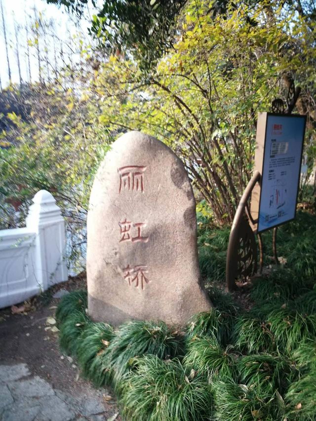 有文曾称此水榭为“激流亭”,但我想,这波光粼粼的河面静谧而安详,何来激流啊?如何做到情景交融名符其实呢?我想起了原先题刻的“䖝二”两字,冒昧地思忖:若把“䖝”字顶端的一撇挪位竖放到“二”字中间,其便为“工”字,而去掉一撇后的“虫”和“工”合在一起即为“虹”。奇哉,看似巧合,原来此水榭与“虹”有缘!我在惊奇之余,更赞叹我们华夏祖先的智慧与文采,造字定义时就已经把形、义、美德贯穿于其中,奥妙神奇的汉字真是博大精深啊! 由此水榭向南观望,它昼夜注视着的长桥犹如耀眼的彩虹,此桥名曰“丽虹”,既取自丽娃河的“丽”字,又与“虹”神似,是最恰当不过的了。由此称水榭为“观虹榭”便是水到渠成贴切而又自然。丽娃河上既有凌空飞架的丽虹桥,又有美轮美奂的“观虹榭”毗邻而居,相伴相随,彼此呼应,可谓珠联璧合,美景天成,“水榭观虹”名至实归矣!