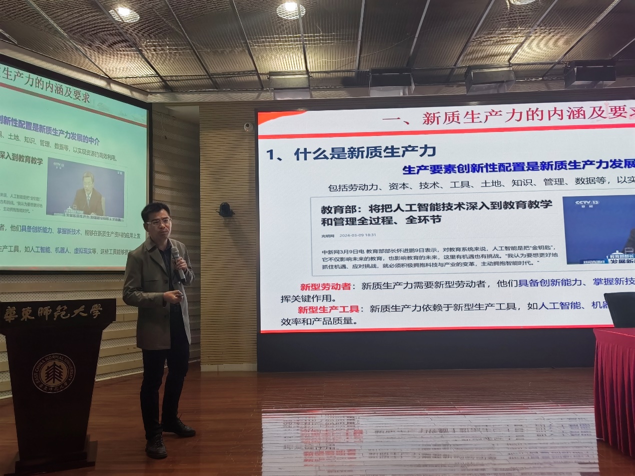 接着,化学与分子工程学院挂职副院长、贵州六盘水师范学院化学与材料工程学院院长雷以柱教授为学员们进行首场讲座,报告主题为“深刻把握新质生产力的内涵及要求,为推动高质量发展贡献高校力量”。雷老师结合自身教学和科研的相关工作,深刻阐释了新质生产力的内涵及要求,以及高校在锻造新质生产力方面的应有之力。他特别讲到,高校是发展新质生产力的重要力量和关键路径,鼓励参训学员,心怀“国之大者”,抓住师大的宝贵环境,在学习科研和生活中提高自身综合素质和创新能力,做“与国家民族同呼吸共命运”的“强国一代”。