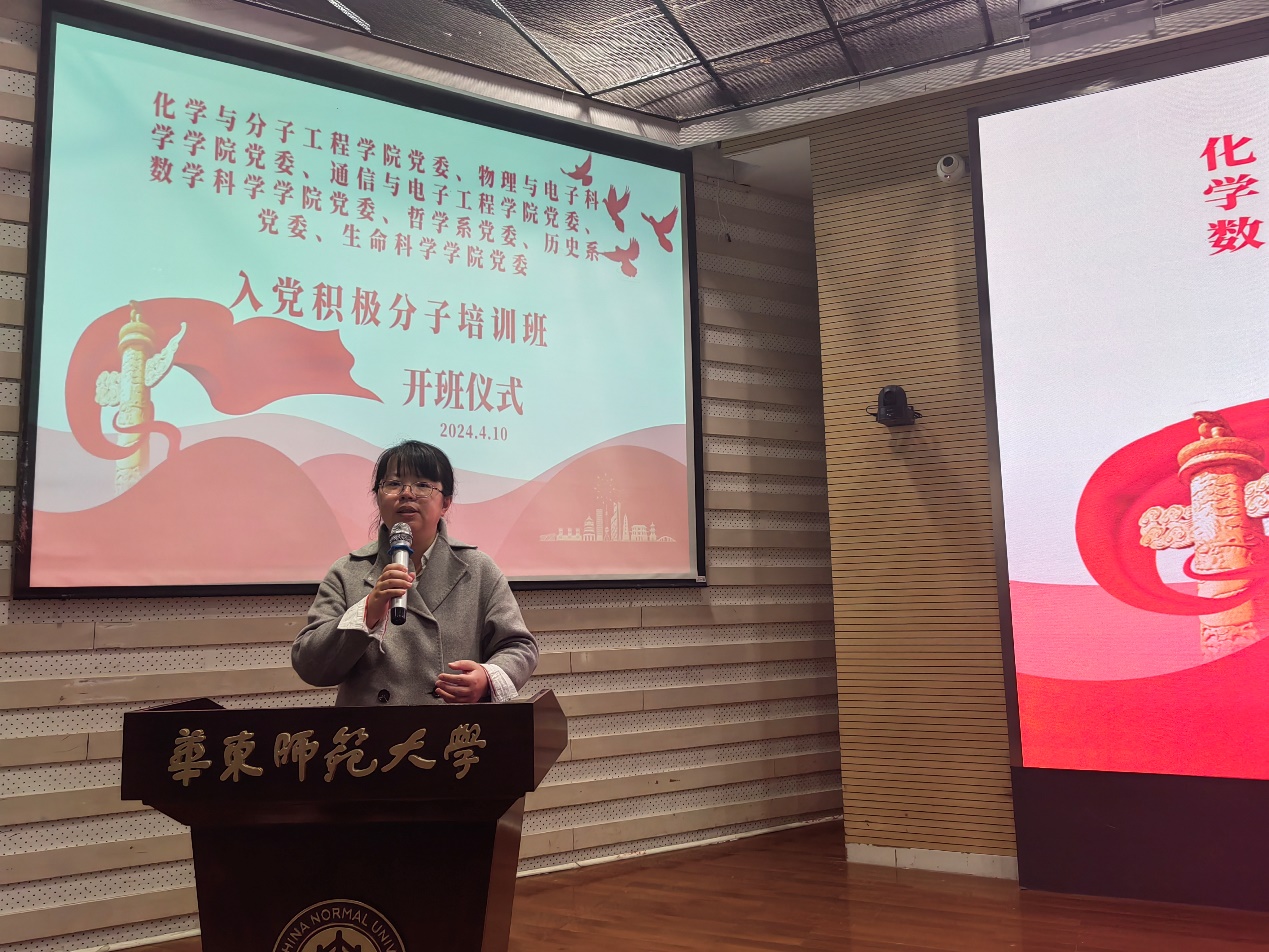 4月10日下午,我院和化学与分子工程学院、数学科学学院、物理与电子科学学院、哲学系、历史学系、生命科学学院联合举办的2024年入党积极分子(研究生)培训班和入党积极分子(本科生)培训班在闵行校区学生之家C区报告厅顺利开班,共有183名研究生和159名本科生参加。开班仪式由化学与分子工程学院党委副书记王婷婷主持。