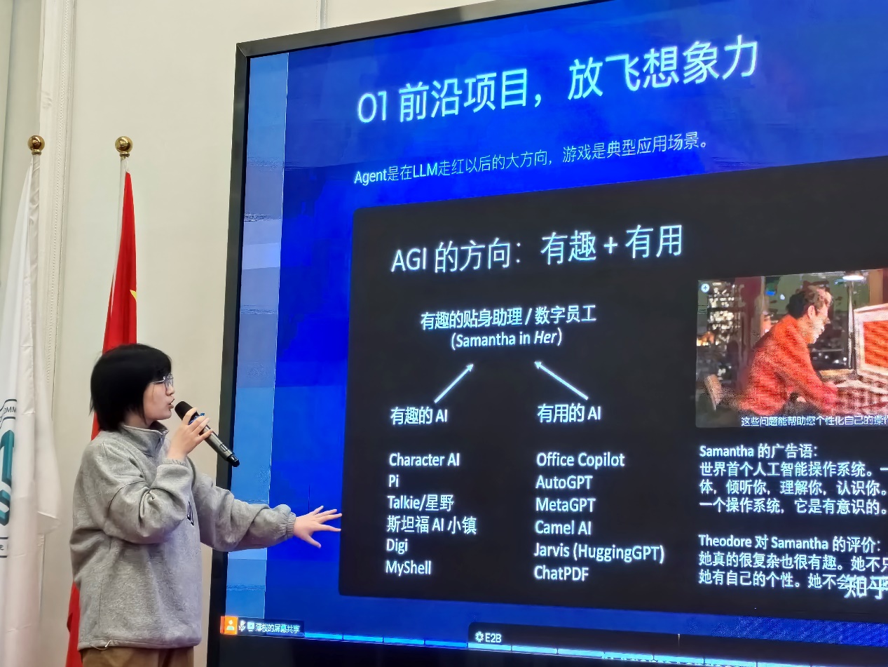 思勉人文高等研究院人工智能艺术和媒介论结合方向的研究生魏萱作为分享嘉宾,围绕AI落地场景、产品和方法论等方面介绍时下前沿AI项目、日常AI工具、AI创新创业社群。同时,她以AI在音乐创作、游戏策划等领域的实际应用为例,生动展示了AI在作品生成及效率提升方面的巨大潜力。