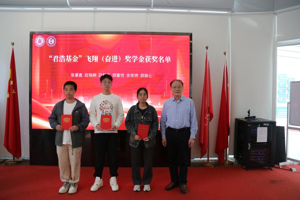 获得君浩飞翔奉献奖学金的2023级硕士研究生占亮亮作为获奖学生代表发言。他由衷感谢褚君浩院士和君浩基金的肯定,作为一名师大学子,我们既要脚踏实地做尖端创新,也要仰望星空怀家国情怀,站在“两个百年”交汇点,青年人肩负科技强国与文明传承的双重使命。
