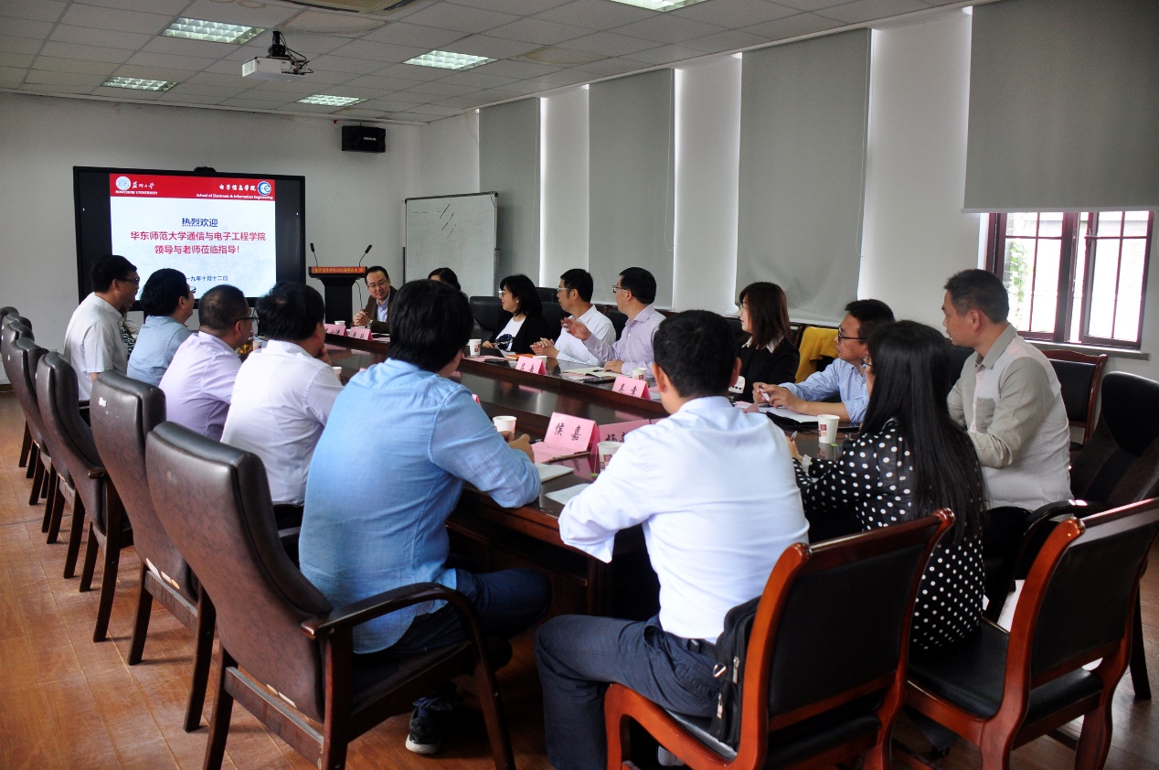 随后,双方就工程教育专业认证进行了深入交流。华东师范大学通信与电子工程学院党委书记郑正奇、院长吕岳均发言对苏州大学电子信息学院的倾情相授、答疑解惑表示感谢。苏州大学电子信息学院党委书记徐群祥总结时指出,华东师范大学和苏州大学在学科建设方面各有所长,大家可以相互借鉴、相互交流,特别是在党建工作方面,希望可以和我院建立密切的合作关系,相互促进。工程教育专业认证是促进本科生教学规范化建设的良好契机,此行交流收获颇丰。